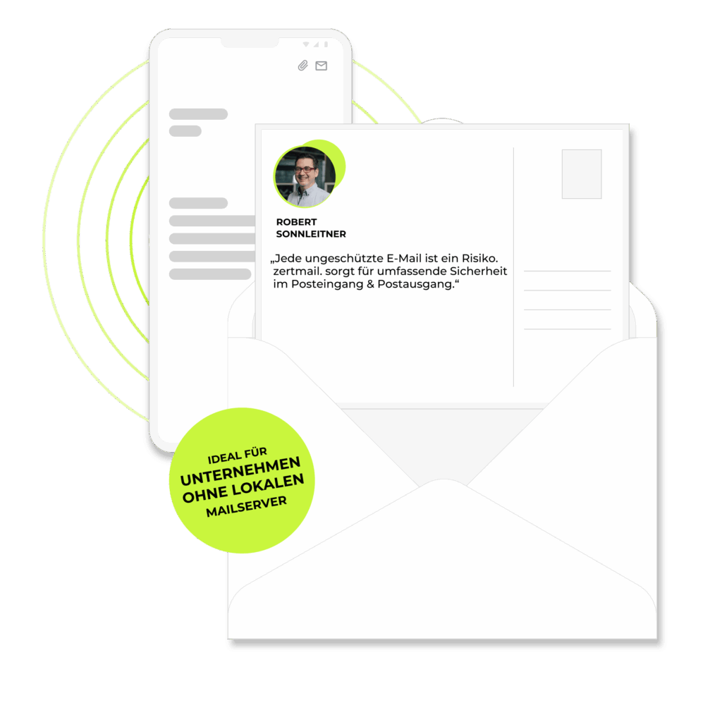 Mit zertmail.pure sichern Sie Ihre bestehenden Mailboxen (MS365 Exchange oder andere Anbieter) sowohl beim Empfangen als auch beim Versenden.